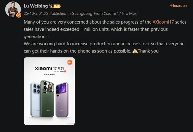 O CEO da Xiaomi, Weibing, expressou orgulho pelo feito, revelando que a nova linha atingiu a marca de 1 milhão de vendas mais rápido do que qualquer modelo anterior da série. Ele acredita que o volume geral de vendas da linha Xiaomi 17 superará o da Xiaomi 15.